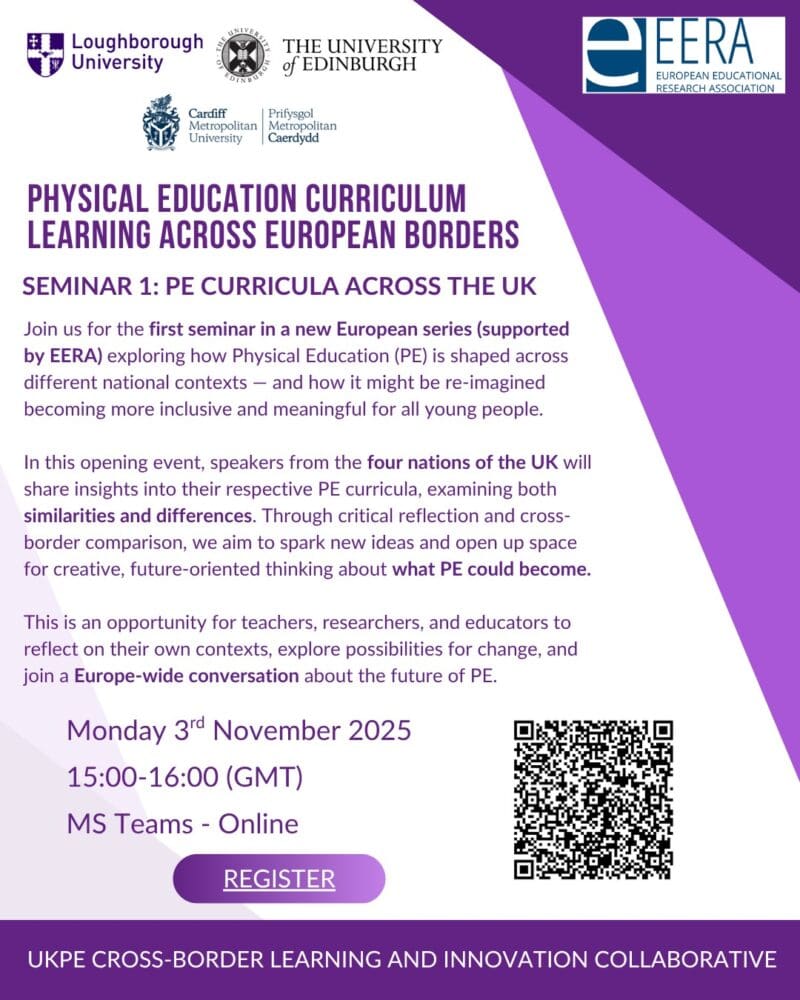 Join us for the first seminar on Monday 3rd November 2025, 15:00–16:00 (GMT): PE Curricula Across the UK.