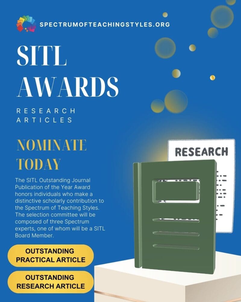 The SITL Outstanding Journal Publication of the Year Award honors individuals who make a distinctive scholarly contribution to the Spectrum of Teaching Styles. Nominations are invited from the research and teaching profession. Authors ARE allowed to nominate themselves.